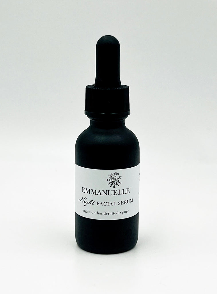Aging will decrease our natural production of sebum, leading to lost elasticity, fine lines, dry skin. Smooth, rich and not heavy, our Organic Night Facial Serum is filled with essential fatty acids and vitamin rich oils which will deeply nourish and replenish the skin.